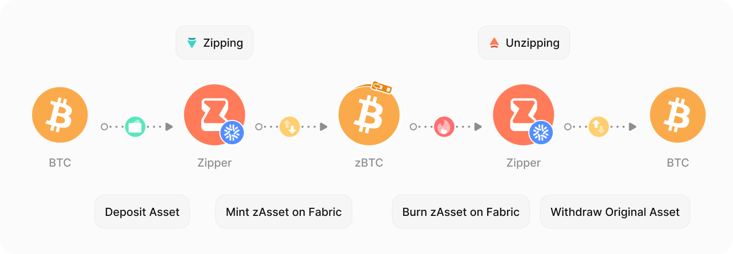 Zipping and unzipping are the core functions of **Zipper**, allowing users to move assets between external blockchains and the **Fabric ecosystem** in a **trustless, transparent and fully collateralized** manner.